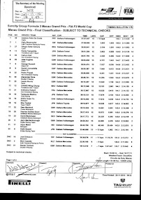 從未在澳門登上三級方程式或東望洋大賽頒獎台的蒙迪路對此次獲勝感到非常滿意。緊隨禾尼身後的可米尼在最後一圈被奧拿(Pepe Oriola)超越,但最終仍壓倒博哥迪(Dusan Borkovic)和費勞斯(Joshua Files),獲得第四名。